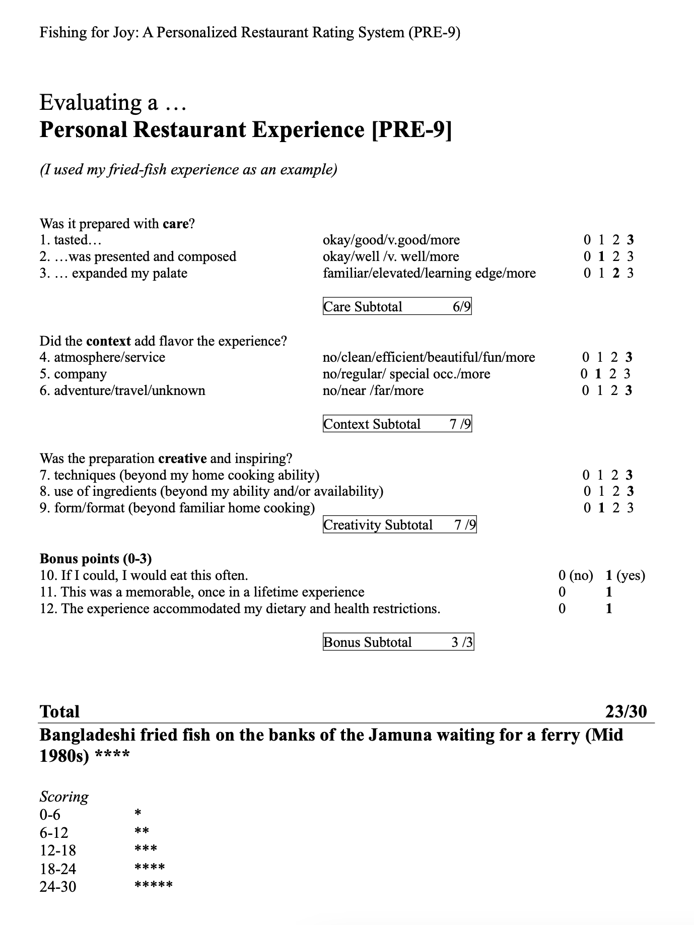 To discover and seek out more transformative fried-fish moments, I rely on my grief and anxiety counseling background. In my field of practice there are examples of measures that objectively rate subjective emotional experience, like satisfaction, depression, anxiety, self-worth etc. To fully appreciate the value of my childhood riverbank fried fish I borrowed the PHQ-9 format that measures depression. It seemed poetically justified to honor the format that identifies isolating depression to help identify connecting joy. The PHQ-9 measures sleep, energy, appetite, concentration, movement, pleasure as well as suicidal thoughts. Anhedonia, a symptom of depression is when what previously brought you joy no longer does so. Imagine having your favorite meal and feeling numb. I hope you donβt recognize this feeling, if you do, please stop reading and reach out. To identify the opposite state of anhedonia, the state of joy and pleasure fully experienced and expressed, a different scale would be needed. To measure my Personal Restaurant Experience (PRE-9) I identified my highest food values: care, context, creativity. Your criteria for gastronomic joy will be different. Other criteria can be leftover potential, zero waste, local, affordable, region specific, history specific, sustainable, strong aversions, strong preferences, dietary restrictions, etc. The scale gives me an instrument of mindful deliberation that can stretch the range of restaurant considerations from humble street food to Yelp-celebrated based on my own criteria for joy.
