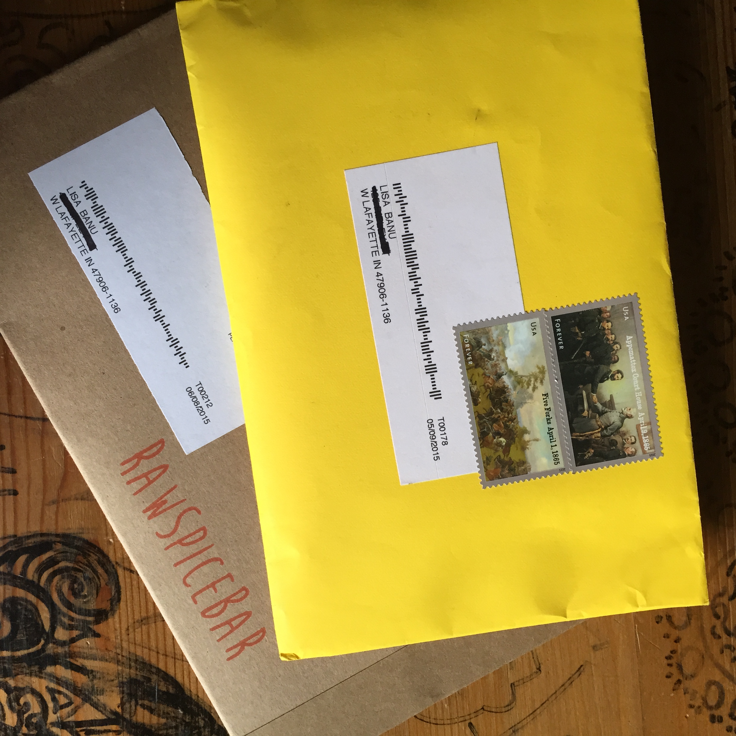 The May and June packages arrived in these brown craft paper envelopes. I loved the bright yellow celebratory feel of the May package. The stamps reminded me of collecting stamps as a kid and the promise of far away places. In contrast, the June brown craft paper envelope promises a fun craft project. Inside, like seeds in a pod the spice packets spilled out along with instruction cards.