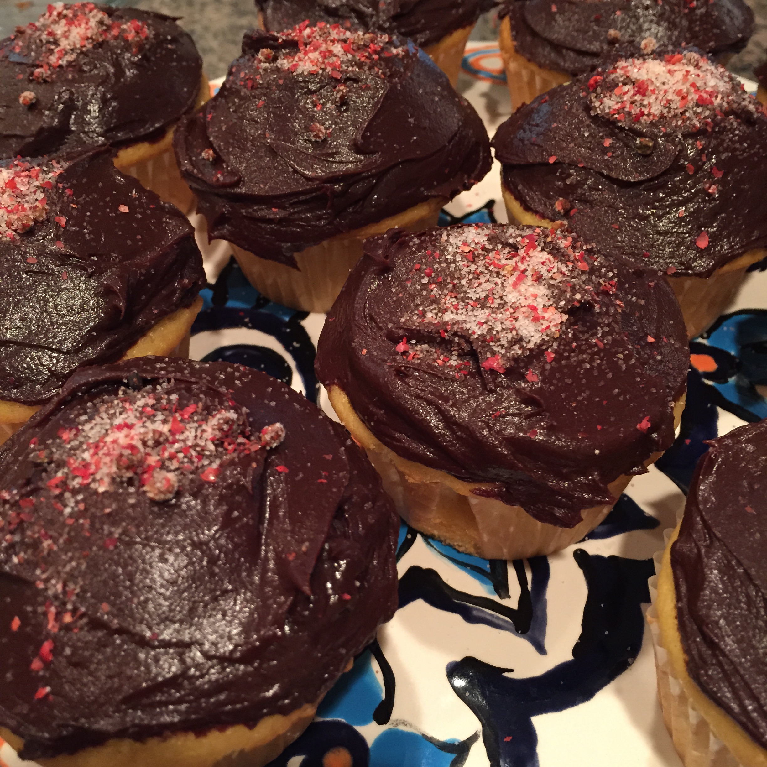 one unintended recovery substitution. I suspect that I didn’t make the cookies thin enough or maybe didn’t bake them long enough. The wafers tasted bland and doughy. A substitution had to be made. The chocolate sauce was superb with the peppercorn salt. The Pink Peppercorn Voladores became Peruvian inspired Chocolate Pink Peppercorn cupcakes. No complaints. Delicious.